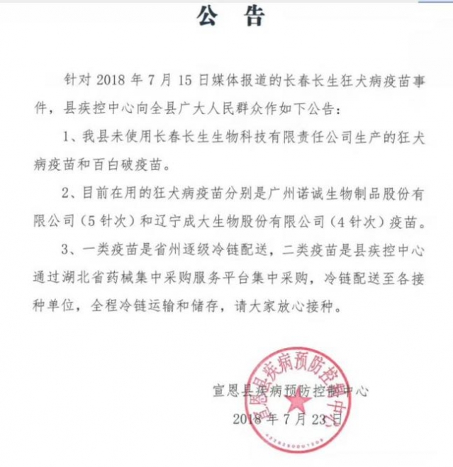 7月23日,宣恩县疾病预防控制中心发布公告,申明宣恩县无问题疫苗流入。