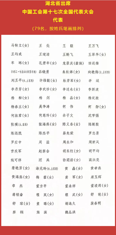 湖北省出席中国工会第十七次全国代表大会代表(79名,按姓氏笔画排列)