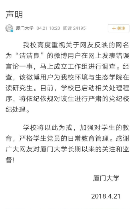 有网友和厦门大学校友发帖表示,厦门大学素有爱国传统,并贴出厦大创办人,爱国华侨陈嘉庚先生为抗日筹集资金,四处奔走的故事。而如今,这位抗日华侨创立的大学里,居然出现了这样一位,身为党员满口“支那”的人,厦门大学也通过官方微博发出回应,表示将严肃处理。