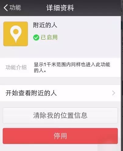 因此,使用手机微信,平时可以关闭这个功能,可依次点击“设置-通用-功能-附近的人”选择“清空并停用”,必要时再开。