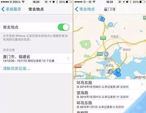 苹果手机的系统中,有“常去地点”功能,可用地图显示你常去的位置。不想让人知道,可点击“设置-隐私-定位服务-系统服务-常去地点”,关闭该选项即可。