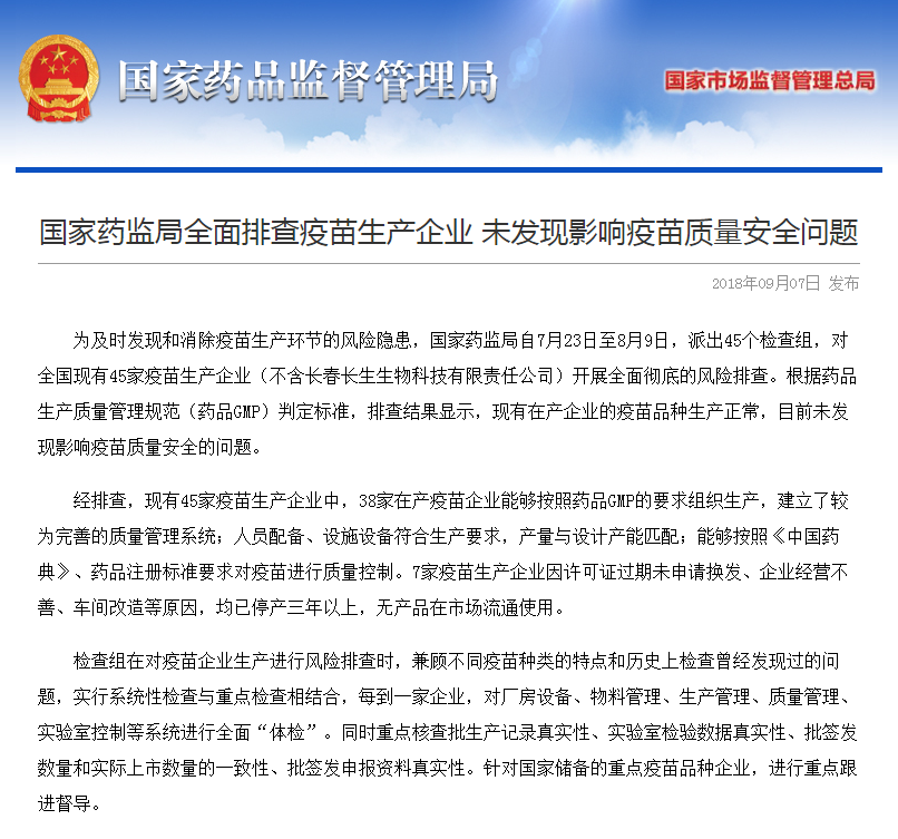 为及时发现和消除疫苗生产环节的风险隐患,国家药监局自7月23日至8月9日,派出45个检查组,对全国现有45家疫苗生产企业(不含长春长生生物科技有限责任公司)开展全面彻底的风险排查。根据药品生产质量管理规范(药品GMP)判定标准,排查结果显示,现有在产企业的疫苗品种生产正常,目前未发现影响疫苗质量安全的问题。