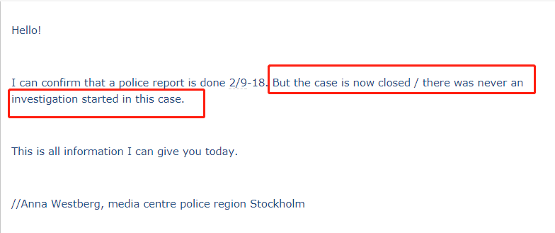 △瑞典警方给《环球时报》的邮件回复。全文为:你好,我可以证实警方9月2日接到报案,但此案已经结案/我们从未对此案进行任何(特殊)调查。这是我今天可以给你的全部信息。