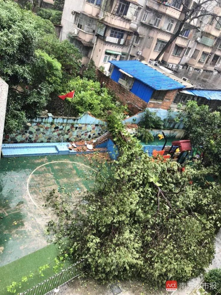9月16日上午9时50分,惠州博罗县城北门路,骤起的狂风将街头大树连根拔起。