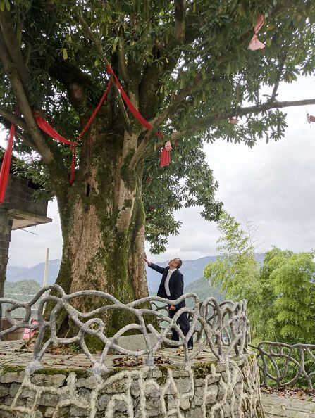 这棵树位于新华村村委会旁边,四周是民居、茶园、青山、竹林,风景异常秀美。