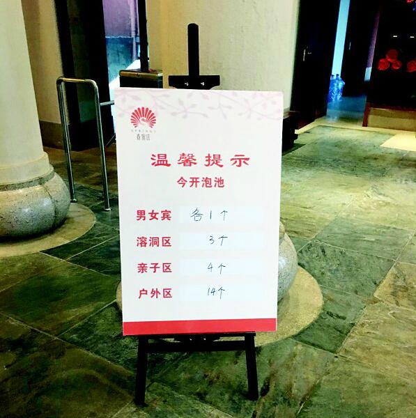 在盛春温泉中心大堂,摆放了开放泡池数量的提示,共开放22个泡池。据工作人员,当天泡池未全部开放,具体数量根据当天游客人数调整,但是门票价格保持不变。