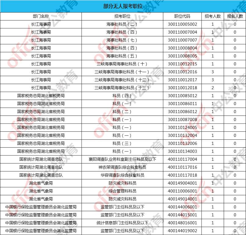 工作地点在湖北的职位共有27个无人报考,占全部职位的7%。下面是无人报考职位一览表(图三),建议广大考生多关注一些较冷职位,避免激烈竞争,结合自身条件,找到属于自己的最佳职位。