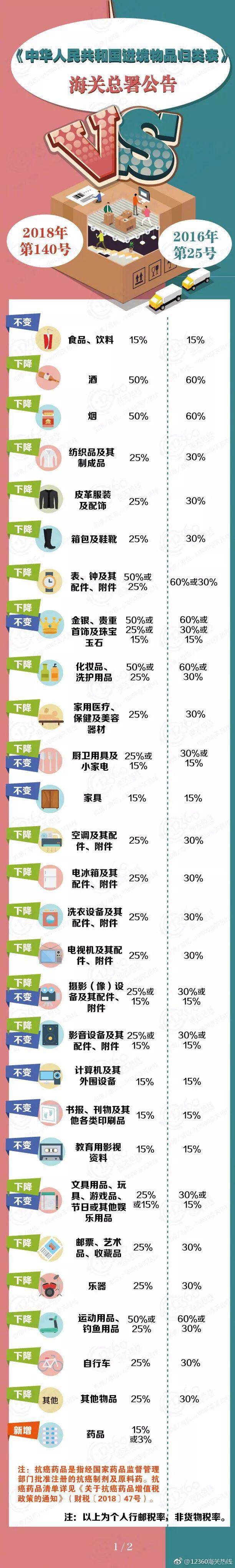 此次纳入降税的商品中,烟、酒、贵重首饰、高尔夫球及球具、高档手表和高档化妆品等类目税率由此前的60%降低到50%,降幅最大;运动用品、纺织品、电视摄像机及其他电器用品、自行车等类目税率由此前的30%降低到25%;奶粉等母婴用品维持15%不变。同时,新增药品类目,税率为15%,其中抗癌药品税率按3%(抗癌药品不涉及消费税,增值税为3%,关税为零)征收,充分体现了国家的便民惠民意愿。