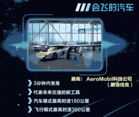 在一万多件产品里,要说最科幻的,这辆“会飞的汽车”当仁不让。3分钟,“高富帅”的汽车形态就可以切换成飞行模式,车门打开,逐渐变成两侧机翼,汽车尾部变成竖立的尾翼,飞行最高时速360公里。它最让人们期待的地方,可能就是降价了吧。