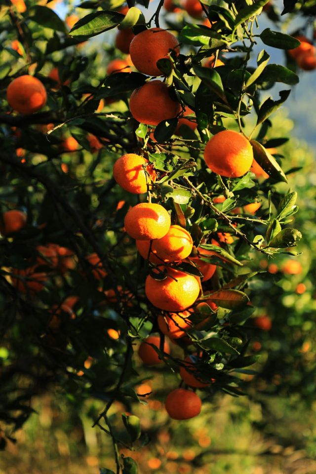 鹤峰县容美镇中村村,成片的桔树,红果累累,压得技头弯不起腰来;成片的柚子树,黄柚结得又大又多。黄柚和红桔,相映成趣。