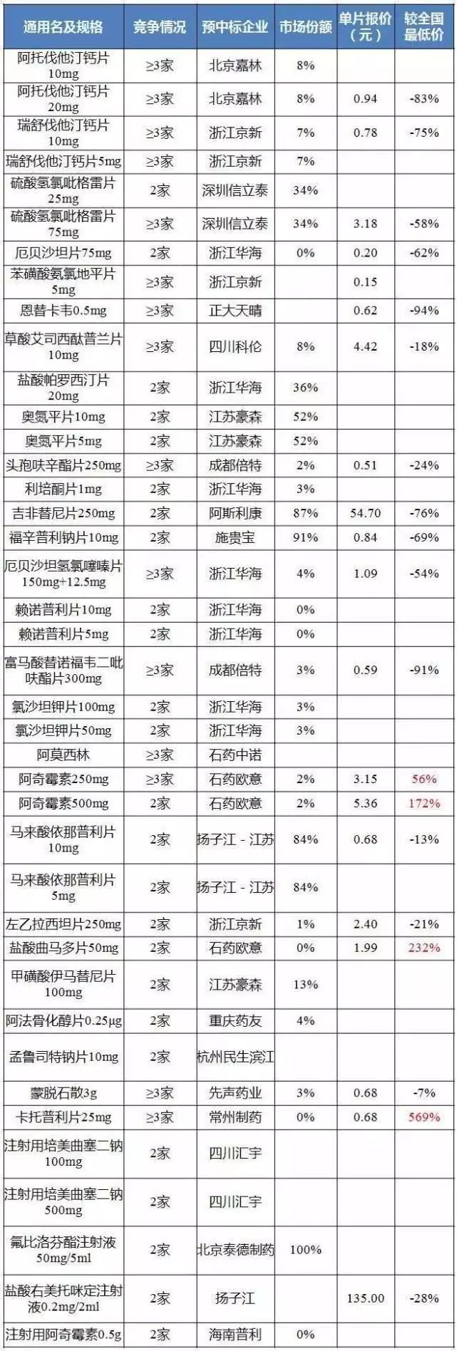 之前,外资药的价格大都高于国产药,从本次预中标结果看,外资药也要降价,分别是阿斯利康的吉非替尼片和百时美施贵宝的福辛普利钠片,降价幅度分别为76%和69%。