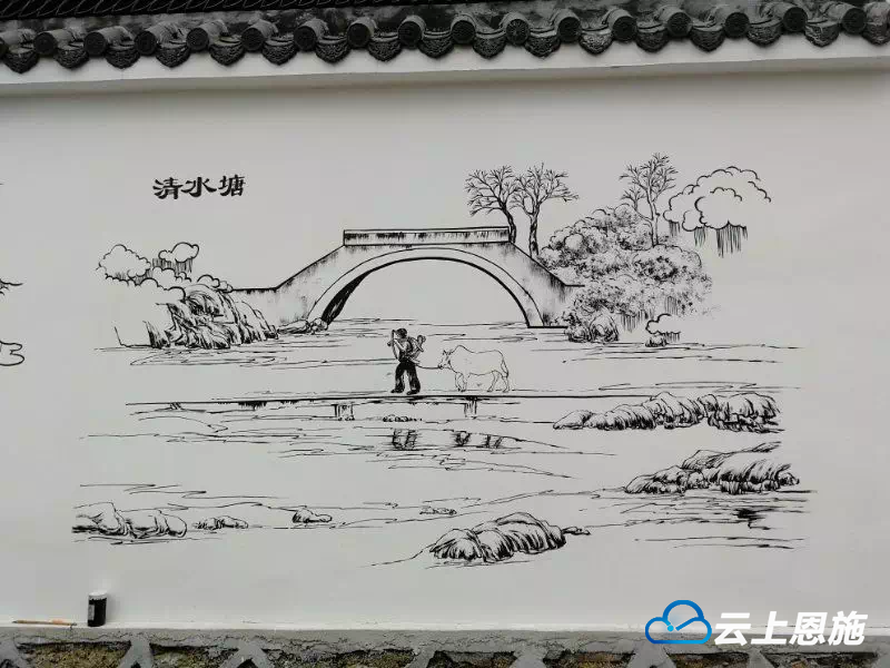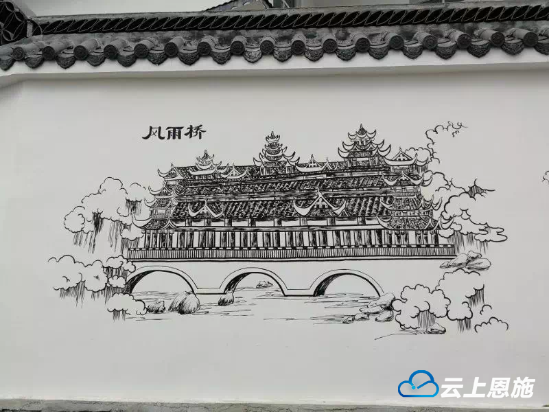 近日,刘晓青以宣恩历史人文资源为创作题材在土苗风情街的白墙上绘就五处手绘墙画,内容包括板寮古街、清水塘、茅坡营、观音堂、风雨桥。