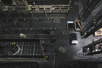 比起动辄演员阵容超百人的其他大剧院自制歌剧的规模来说,这次《唐璜》的演员数不算多,但参与幕后工作的人数却达到近百人,其中制作整台布景的舞美工人近40人,他们在演出几个月前就收到了大剧院发过去的布景图纸,图纸上标明了布景的制作工艺,尺寸和使用方式,随后开始制作工作。完成装台工作的35人,这35位工作人员从一个空舞台到安装成观众演出时看到的布景,需要花两天半的时间。而在演出时,完成道具和布景切换的还有20人,这20人除完成演出时的实时换景外,最重要的工作是要保证在中场休息的15分钟内更换掉上半场的布景。