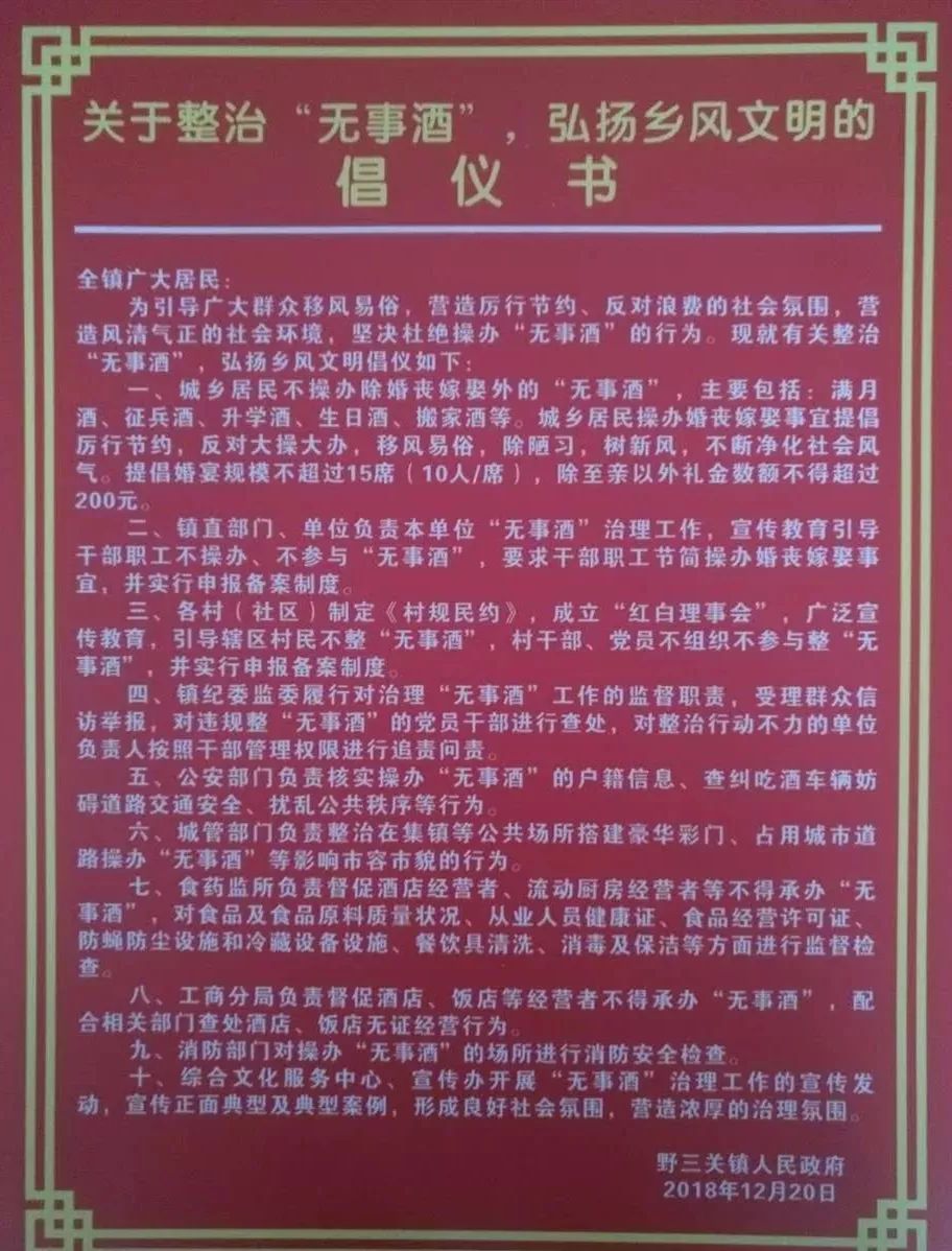 近日,湖北巴东县野三关镇对群众反映最强烈的整“无事酒”的问题,镇人民政府发出了《关于整治“无事酒”弘扬乡风文明的倡议》。