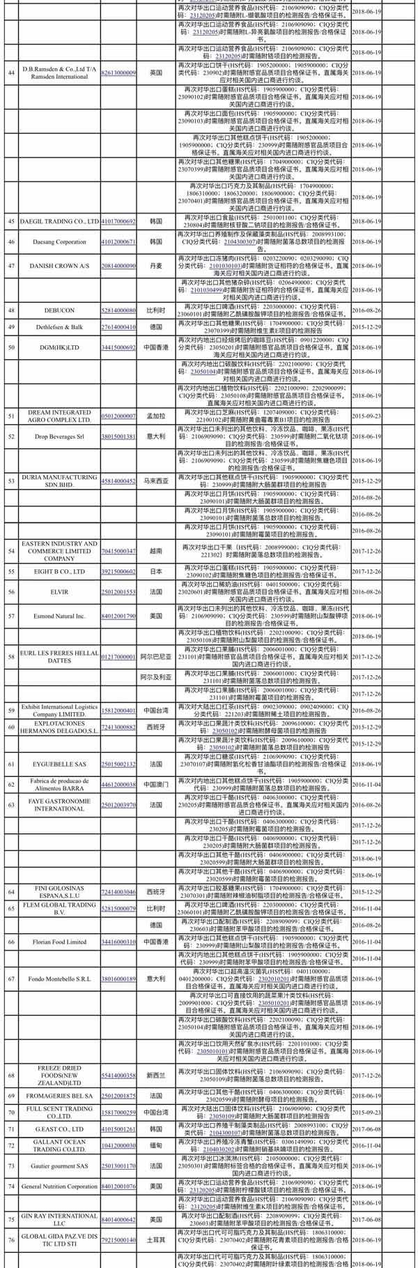 12月26日,海关总署发布进口食品化妆品安全风险预警通告(境外出口商),涉及美国、日本、俄罗斯、加拿大、法国、意大利和中国台湾、中国香港等48个国家和地区的数百个境外出口商。主要问题包括:美国再次对华出口冻猪肉时需附感官品质项目合格保证书,韩国再次出口养殖制作及保藏藻类制品时需随附菌落总数项目的检测报告,印度尼西亚再次出口食用棕榈油时需随附砷项目的检测报告,挪威再次出口养殖冷冻鲑鱼时需随附传染性鲑鱼贫血病项目的检测报告等。