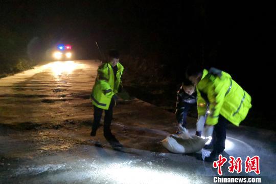 12月28日晚,湖北来凤县一幼童疑似一氧化碳中毒,救护车在救援中遭遇路面结冰被困。民警接警后,寒风中撒盐除冰,顺利护送救护车下山,中毒幼童经治疗转危为安。
