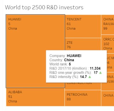 而在全球研发投资排名前50的这一项中,中国的华为排在三星、字母表公司、大众汽车集团以及微软之后,位列第5。华为的竞争对手苹果和高通,则分别排在第7位和第28位。