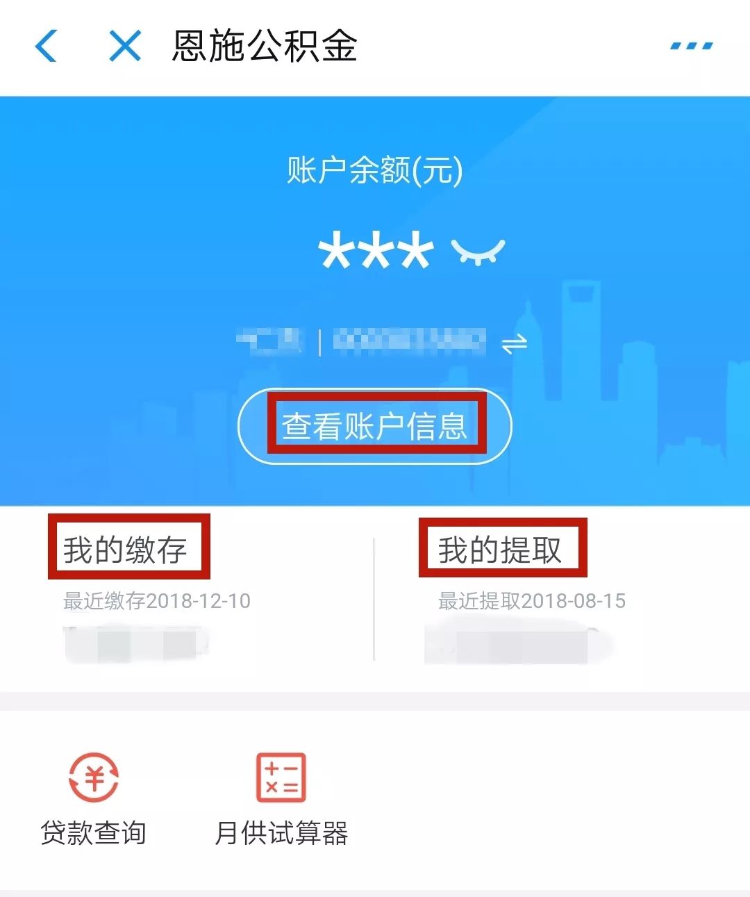 点击“我的缴存”、“我的提取”、“查看账户信息”、“贷款查询”可以查看更详细的信息哦~