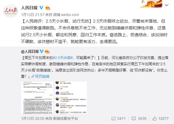 【人民微评:2.5天小长假,试行无妨】2.5天休假呼之欲出,尽管尚未落地,但这种探索值得鼓励。不会休息就不会工作,无论鼓励错峰休假和弹性休息,还是试行2.5天小长假,都应和民意,回归工作本质。奋进路上,劳逸结合,该加油时不硬熬,该休憩时不蛮干,就能更有活力,走得更远。