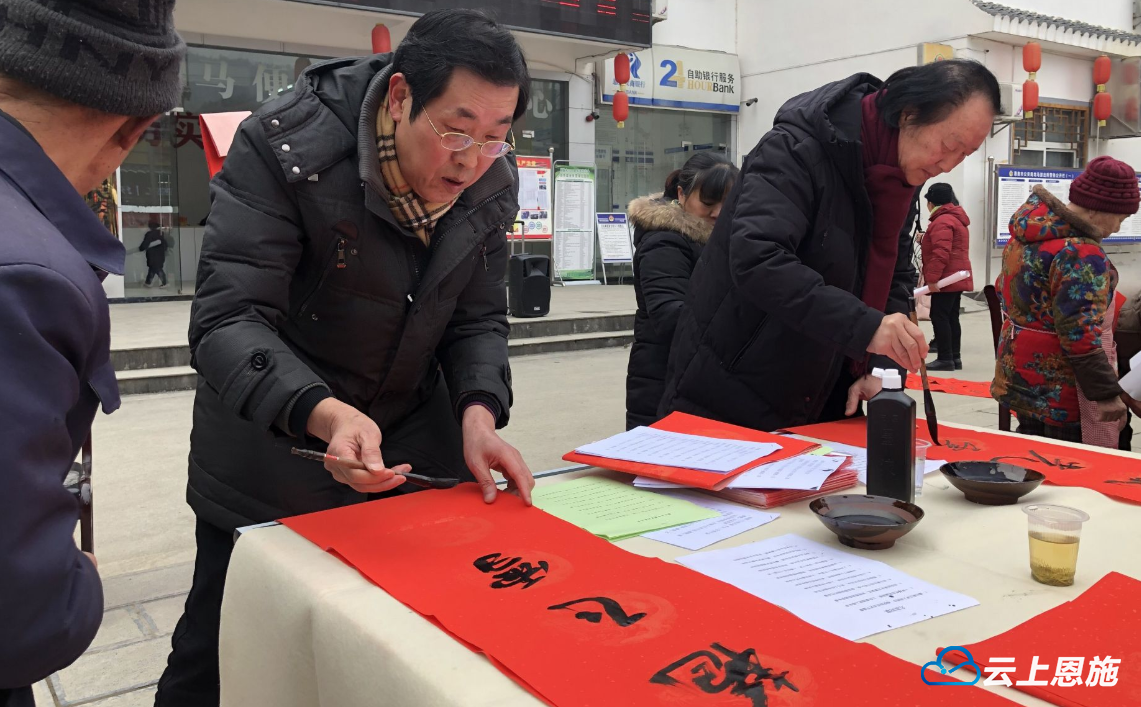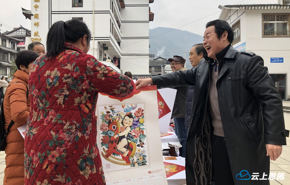 云上恩施报道 (记者 胡园 刘梦)1月21日,恩施市龙凤镇龙马村村委会的广场前聚集了不少村民,大家一边排队领年画,一边等待着湖北省美术院和恩施州美术家协会的书法家们,为自家写新春对联。