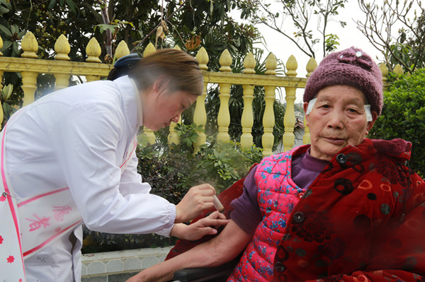 ”红花“青年志愿者为老人进行穴位按摩,老人感动得哭了