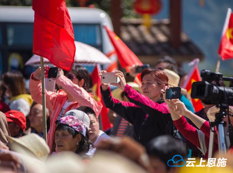 “我和我的祖国,一刻也不能分割……”舞台上、山野间、桃花林中飘扬着五星红旗,振奋人心的歌声响彻在当阳坝的上空,演员们与观众齐声高唱《我和我的祖国》,对祖国的热爱之情直叙胸臆,对家乡的喜爱之心溢于言表。
