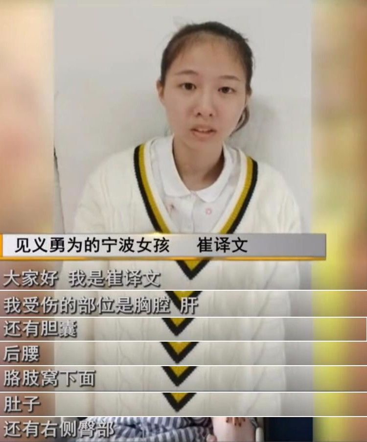 这两天,一个女孩震撼了全网。面对歹徒,20岁的女大学生用血肉之躯替同学挡了8刀! 她叫崔译文,今年20岁,浙江宁波人,在广西桂林读大学。这位勇敢的宁波女孩被授予了“见义勇为积极分子”称号。 母亲问她后不后悔,她却笃定地说:“如果再选一次,我还是会冲上去。” 如今已出院返校的她,拍摄了一段视频给大家报平安,听听都让人心疼: 勇敢的女孩! 愿你一生顺遂,再无风雨! 来源:人民日报 责任编辑:董晶菁 主编:孙跃