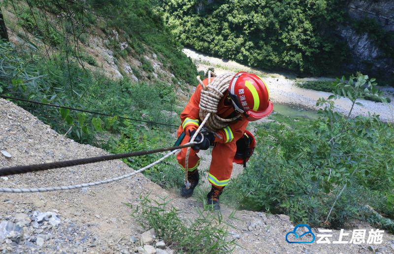 云上恩施报道(融媒体记者 邓蔚婕 通讯员 许国虎 刘子轩)5月23日中午,湖北恩施大峡谷景区附近,4名驴友顺着废弃缆车索道,下至100余米深的峡谷探险。4人探险返回地面后,其中一人发现自己的手机不见了,便叫同伴在地面等候,自己再次下至峡谷寻找手机,不想被困在约70米的位置进退两难。地面同伴几次尝试救援失败后,向消防部门求助。消防救援人员赶到现场经过40多分钟的营救,将被困男子营救到地面。