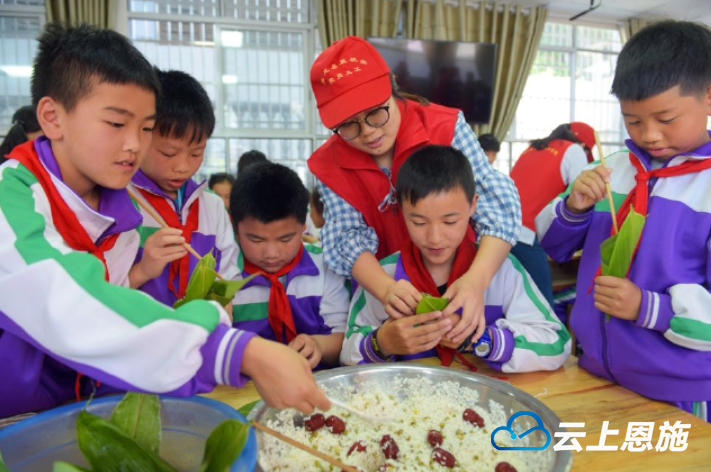 云上恩施报道(宣恩通联记者 王俊 李灿)6月4日,在宣恩县晓关侗族乡中心小学,志愿者与孩子们在包粽子。 当日,宣恩县志愿者来到晓关侗族乡中心小学,与学校里的留守儿童一起包粽子、吃粽子,学习弘扬传统文化习俗,让留守孩子过一个开心的端午节。 责任编辑:谭晓慧 主编:孙跃