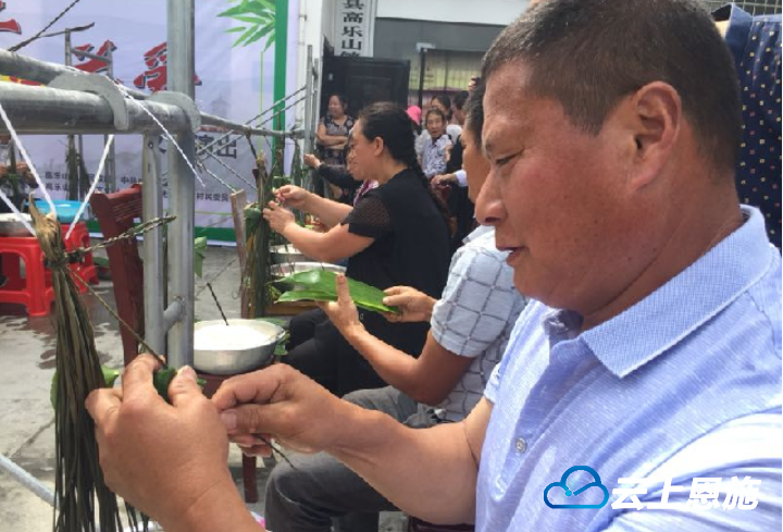 图为6月6日,来凤县龙凤文化中心广场上,市民们正在参加包粽子比赛。