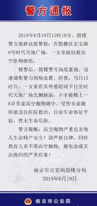 6月20日凌晨1点55分,南京鼓楼警方发出通报称,女童经过时不幸被楼上8岁男童高空抛物砸中。受伤女童随即被送往医院救治,目前生命体征平稳,暂无生命危险。