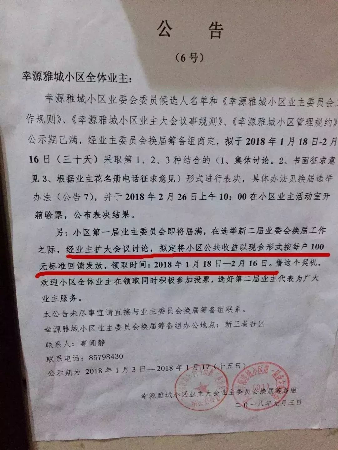 2018年1月份,武汉江岸幸源雅城小区业委会发出一则公示:临近春节,业委会决定用小区公共收益给业主发红包,每户100元。