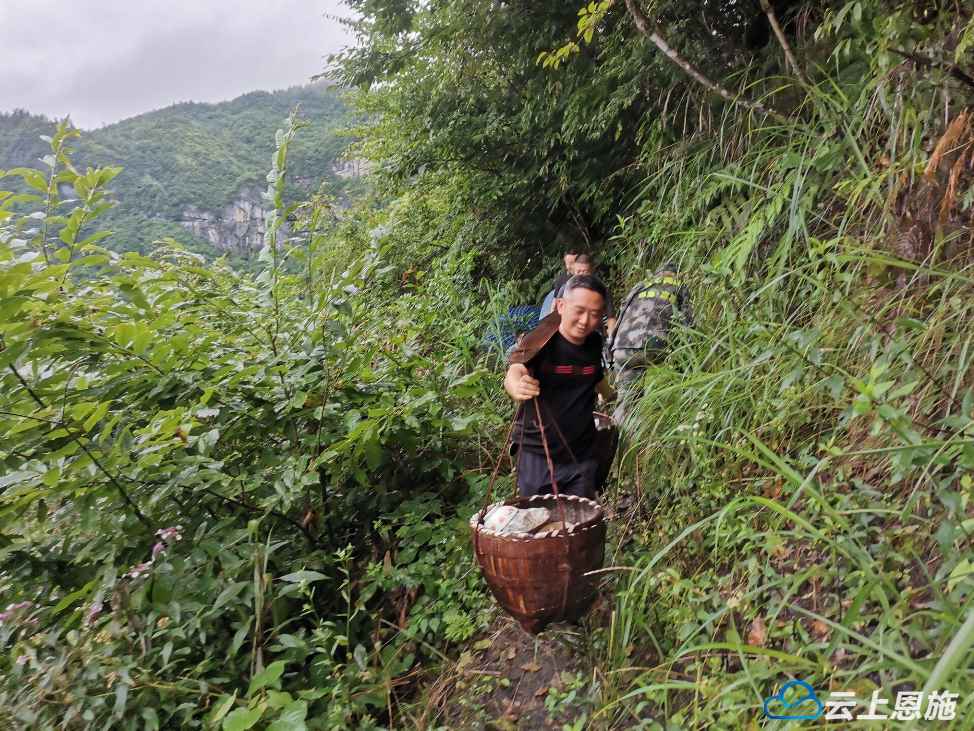 最难的是半山腰1户村民,单家独户,通往他家的路少有人走,青苔路滑,稍不留神就可能摔下山坡灌木丛,走了大约40分钟,志愿者们终于到了唐丙政家。顾不上休息,大家往背篓、箩兜里装好腊肉、衣物、粮食等,又一一往回走。询问得知老式木房已经出现裂缝塌方迹象,几名青壮年找来绳索,做好担架,把生猪捆绑在担架上,踉踉跄跄往山外挪。雨水夹杂着汗水,途中,插曲不断,等转移完毕,志愿者们都瘫倒在地,精疲力尽。