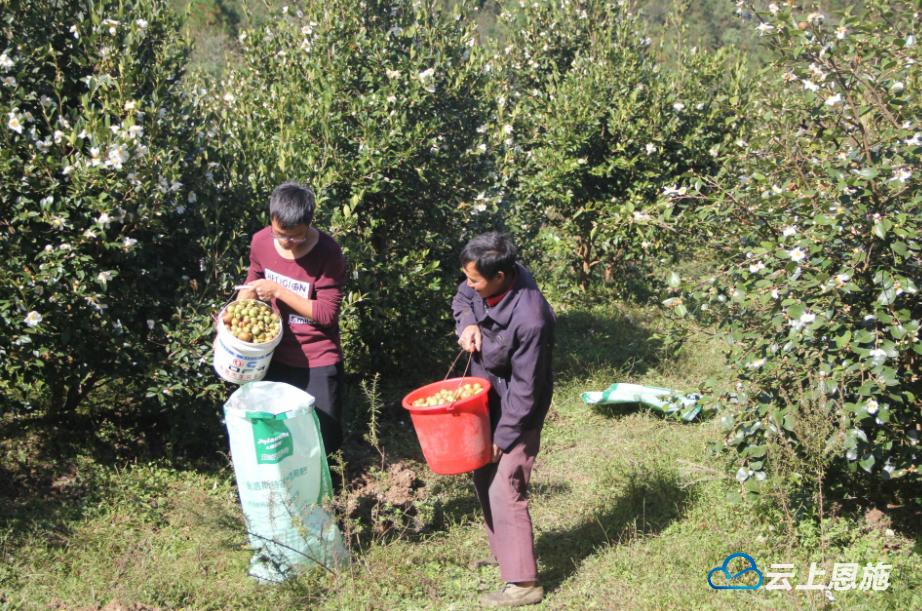 10月26日,记者在咸丰县坪坝营镇新场村,见到茶农正兴高采烈地采摘油茶果。霜降后,该县茶农抢抓晴好天气加紧采摘。