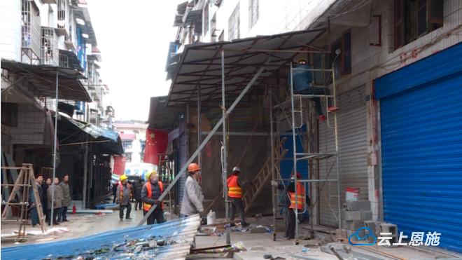 在来凤县金凤市场内,工作人员把一块块破旧的蓝色钢棚推倒,意味着该市场长达20余年的脏乱差环境将得到彻底改变。