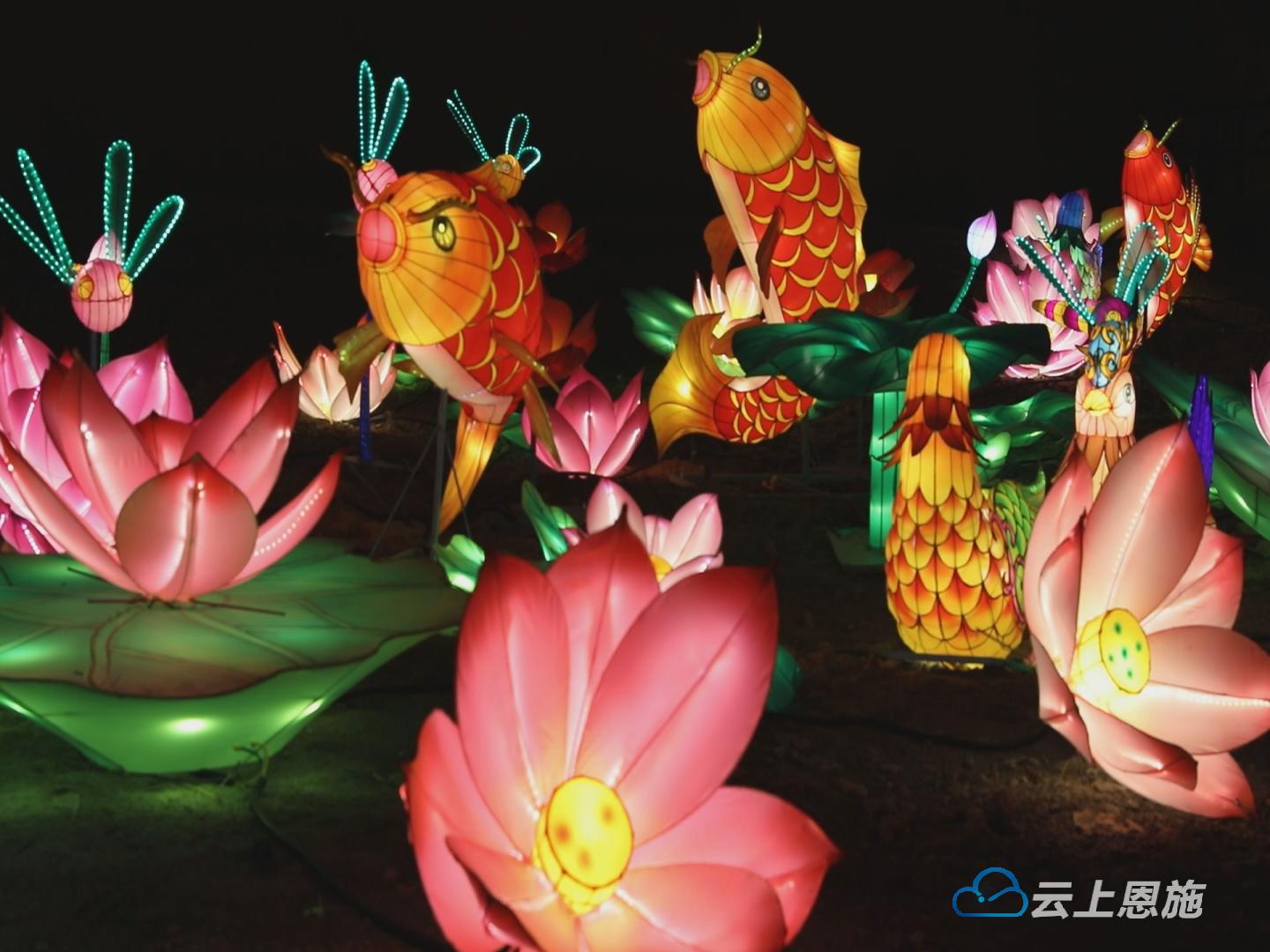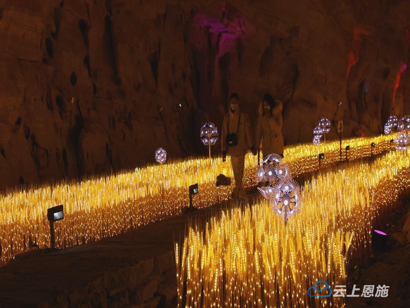 进入洞内,就可以看到诸如龙头船、财神爷、鲤鱼跃龙门、爱情表白等25组特色主题的灯组,遍布在利川腾龙洞内的各处景点附近,美轮美奂的造型、绚丽多彩的灯光、充满科技感的全新腾龙洞,让每一位身处其中的游客都有一种“光影处处有 人在灯海游”的绚烂效果。