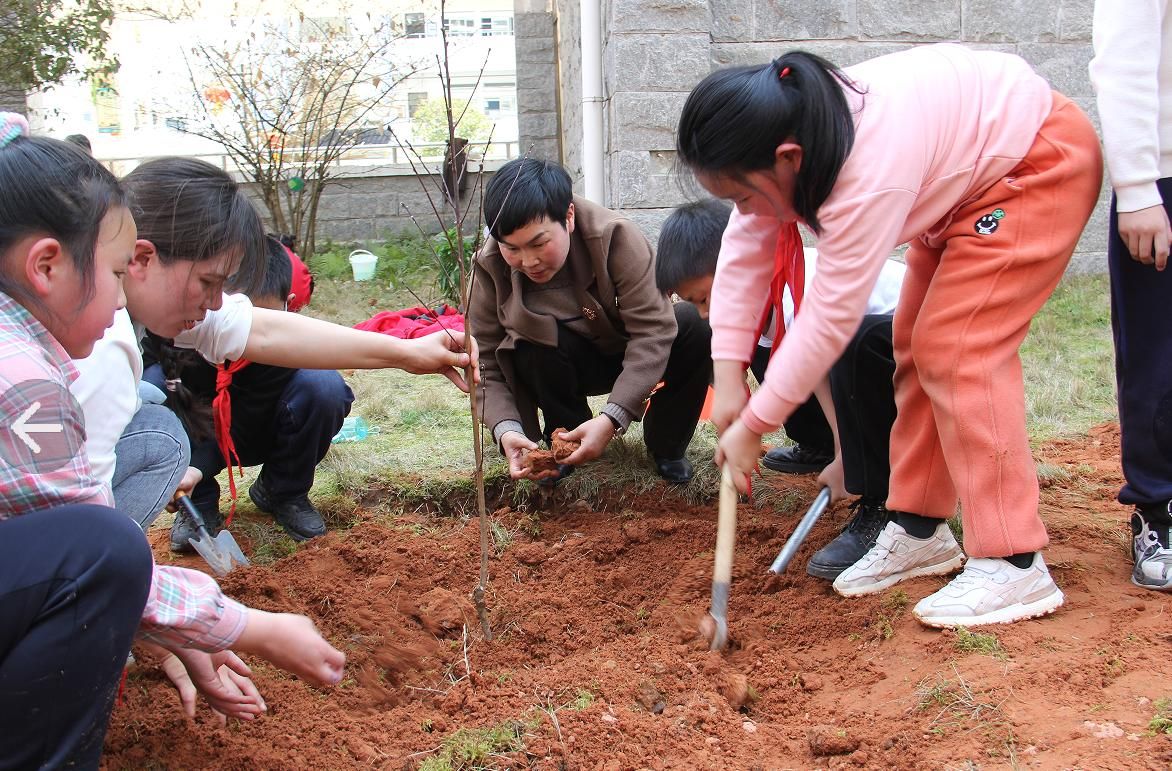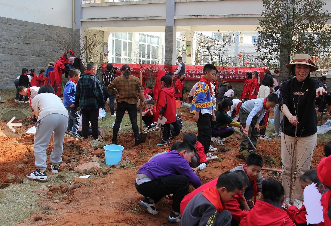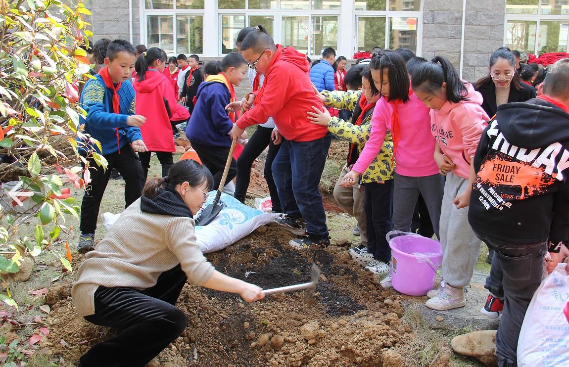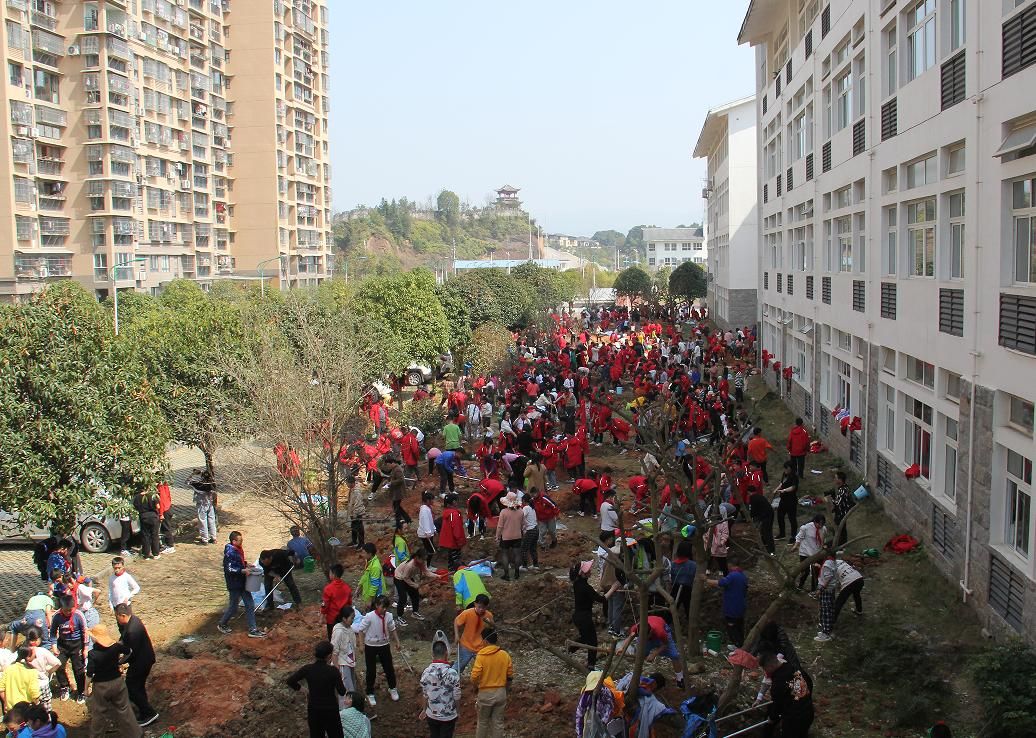 3月11日,在第44个植树节到来之际,硒都民族实验小学全体党员教师、班主任和部分学科教师、家长代表600余人在校园楼后的空草坪上开展了“我和桃李共成长”综合实践活动。