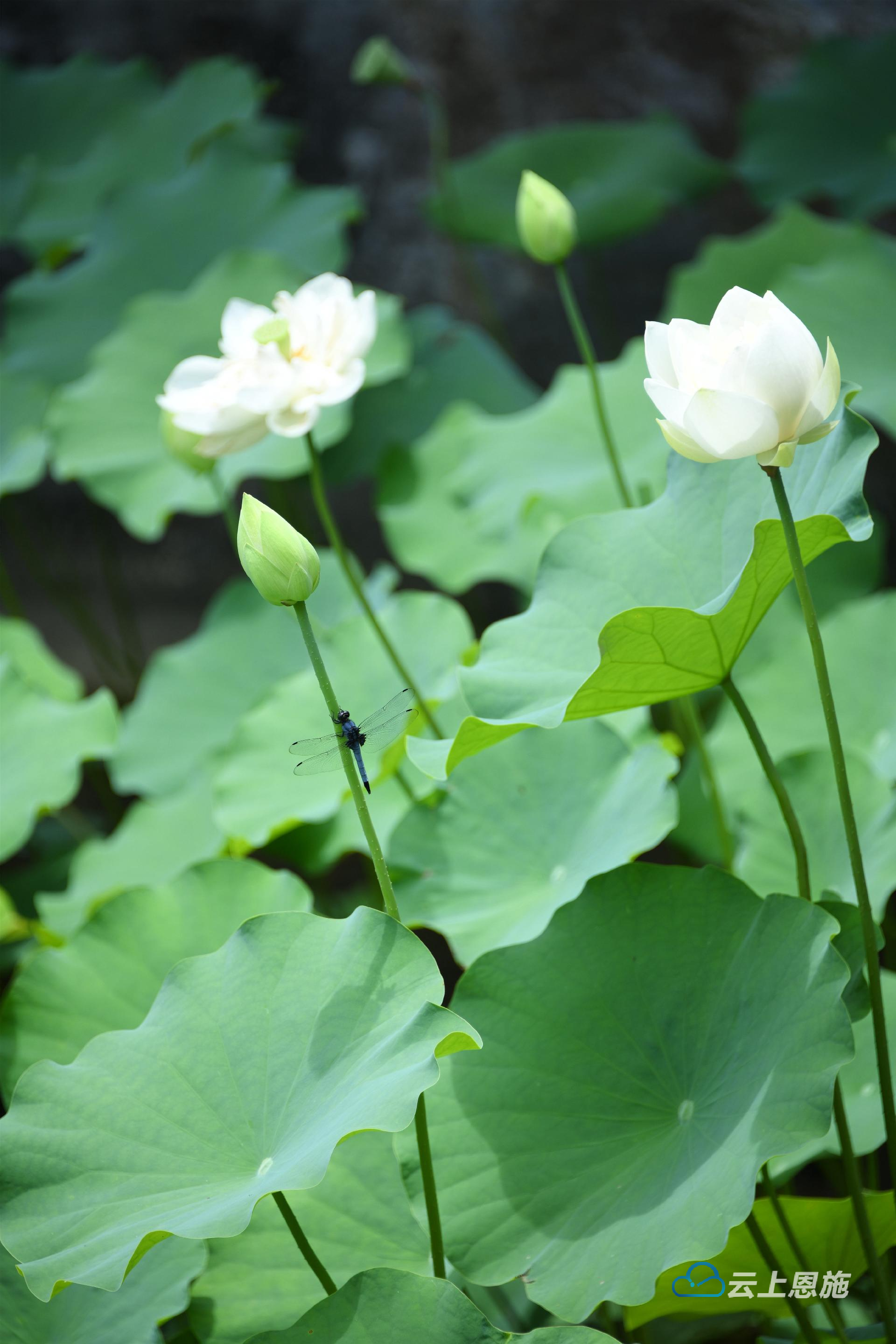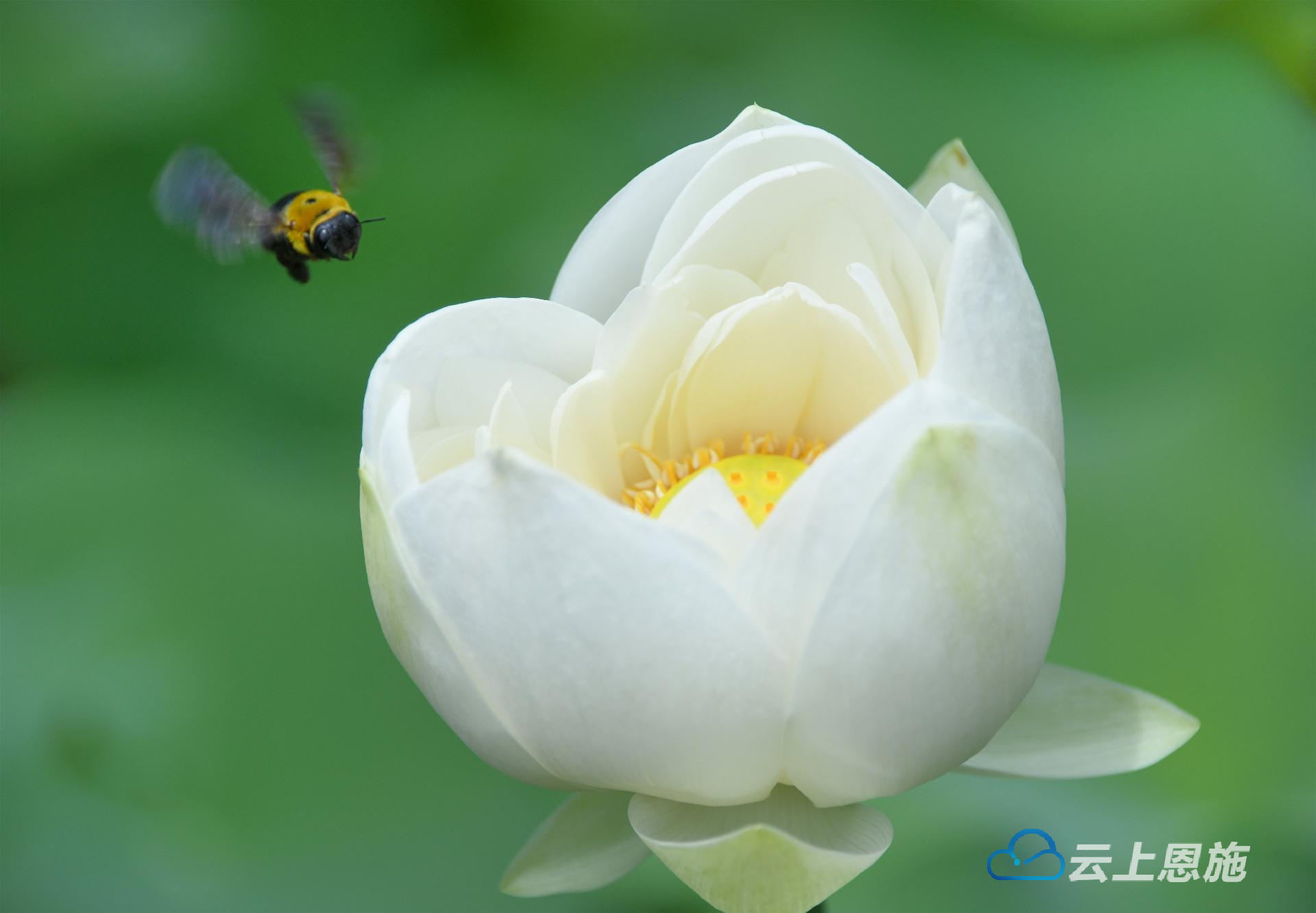 盛夏时节,宣恩县贡水河国家湿地公园的荷花竞相绽放,吸引蜻蜓、蜜蜂花间停留,别有一番韵味。