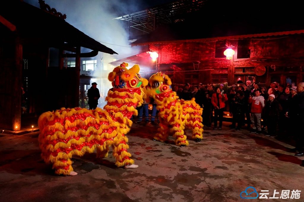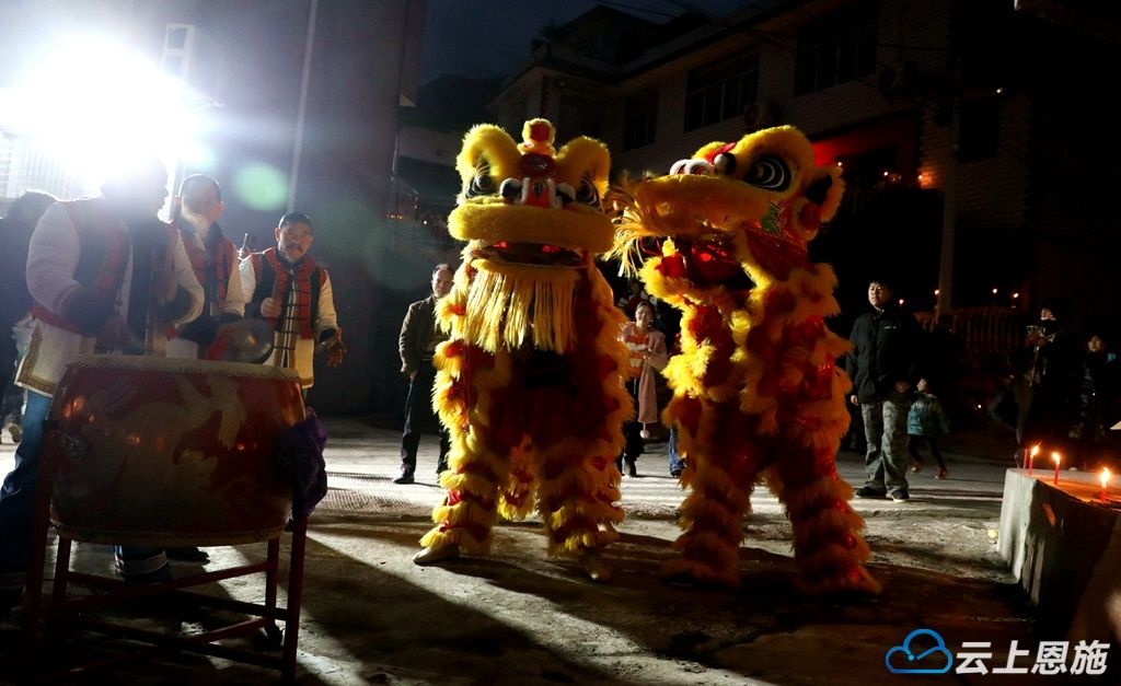 夜色正浓,伴随着欢快的锣鼓声,两只金毛狮子载着满满的祝福巡游而来。它们摇头摆尾,时而高高跃起,时而逗趣眨眼,沿途传递着吉祥和祝福,吸引众多村民驻足观赏。