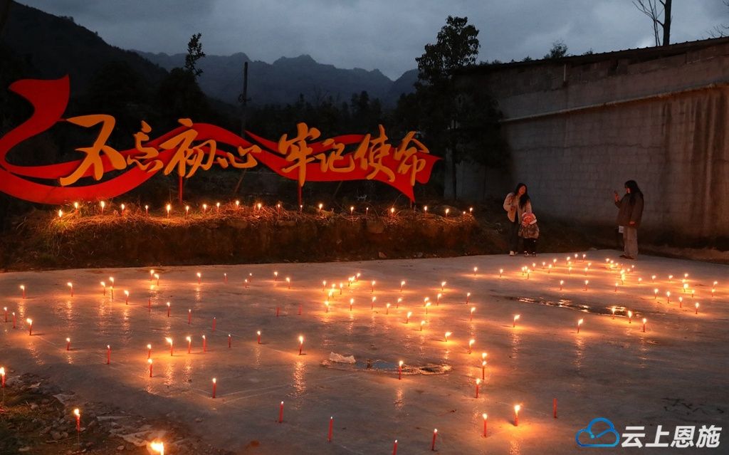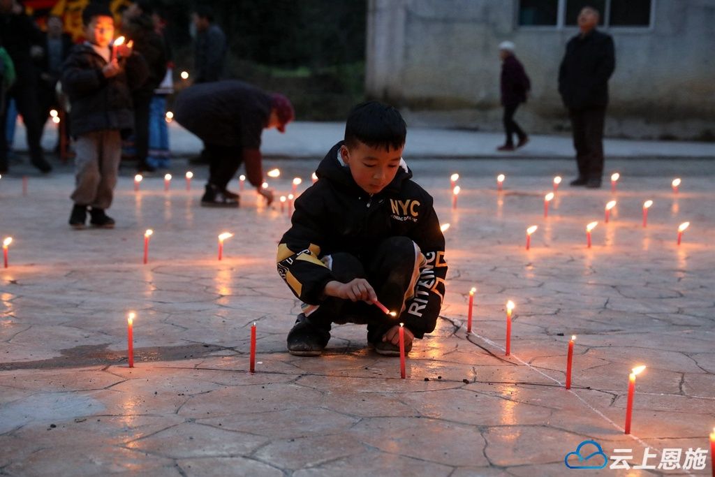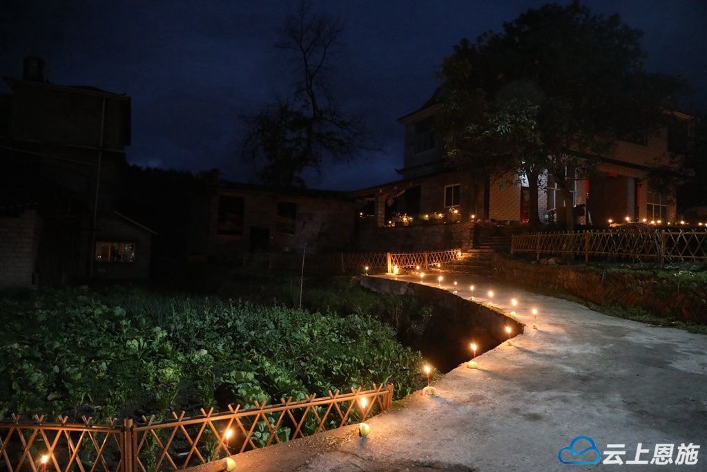 当天,晓溪村村民谭凤华早早地吃过晚饭,把点燃的红烛小心翼翼地插在门前及路边。随着夜色临近,其他村民也都纷纷走出屋外,邻里之间接龙点亮蜡烛。不一会儿,整个山寨被装点得星光点点、灯火摇曳。