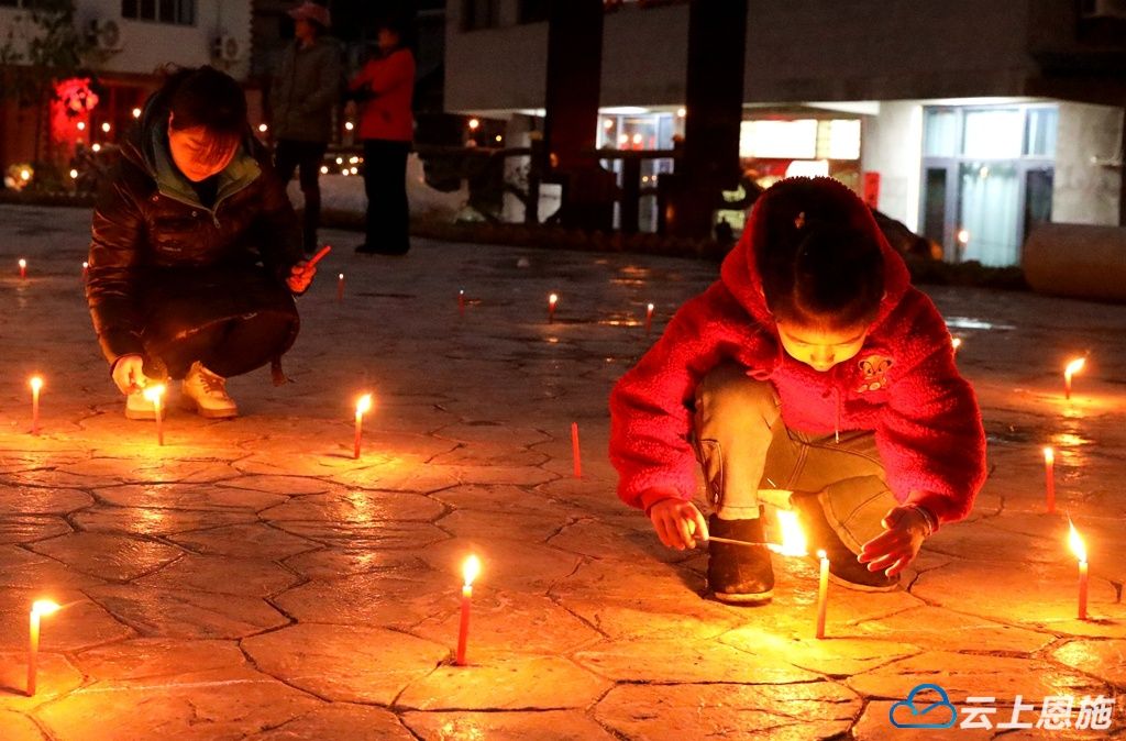 “很开心,很好玩!”7岁的谭诗媛和小朋友们一起还在院子的广场上“凑热闹”,在大人地陪伴下用蜡烛“玩”出“晓溪”字样、五角星等图案。