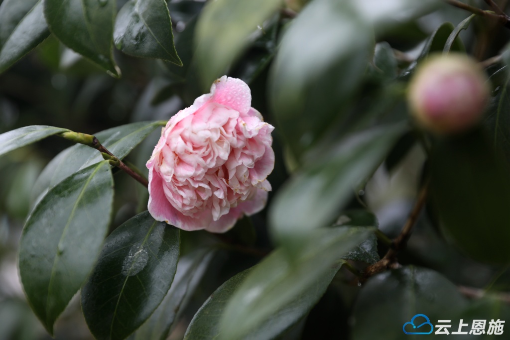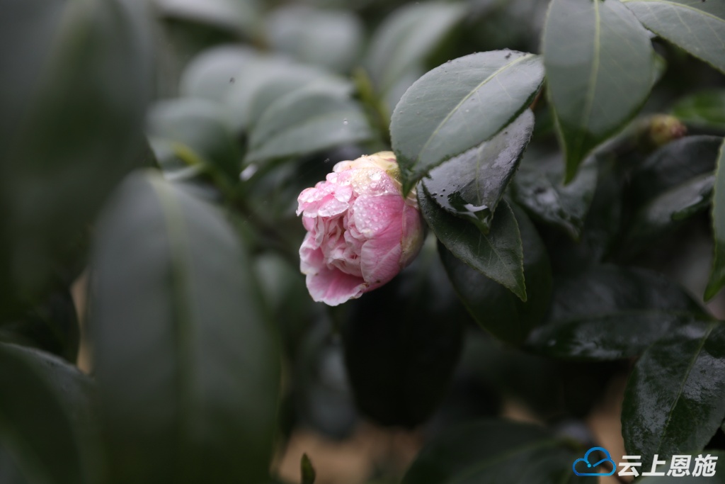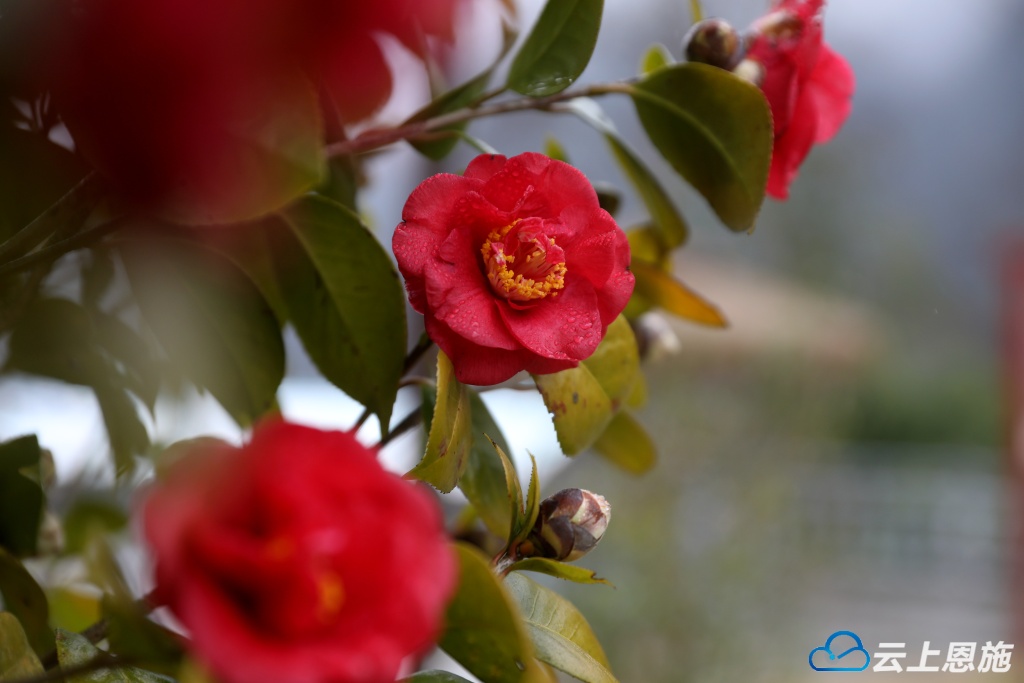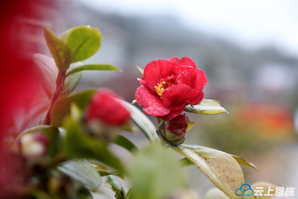 一场春雨过后,下坪乡留驾村红色文化广场上的山茶花开的更艳了,花朵上凝聚了晶莹的水珠,映着山茶花的红显的晶莹剔透。