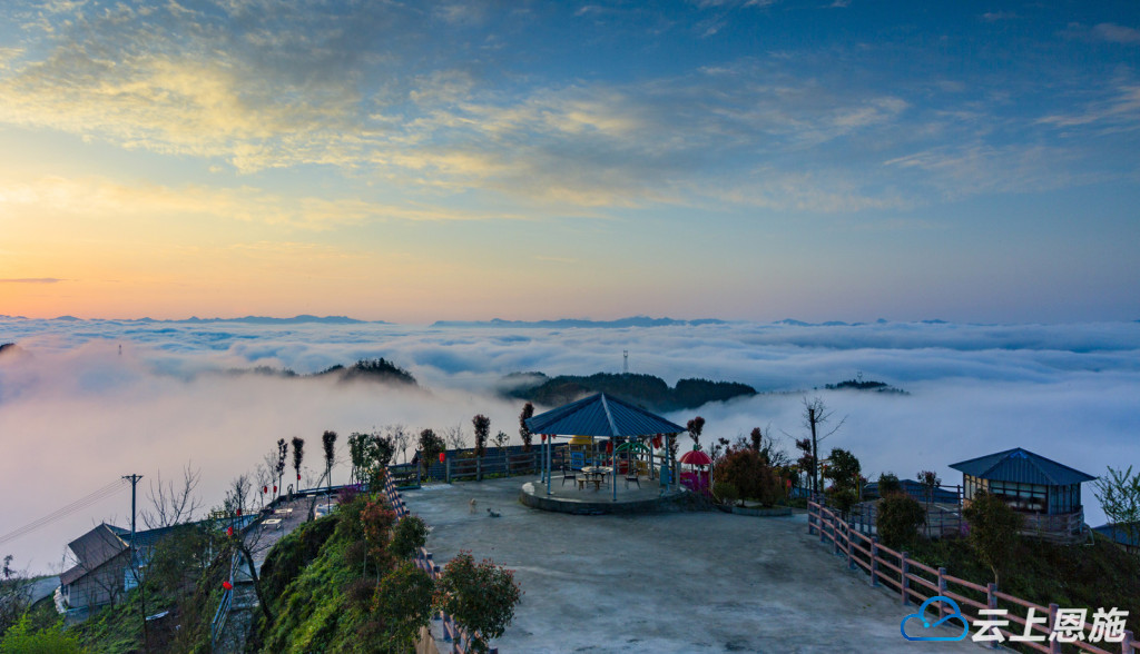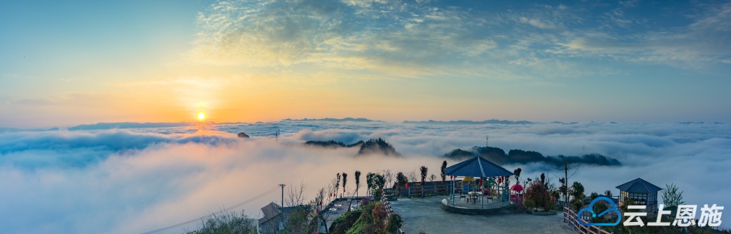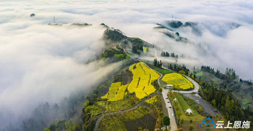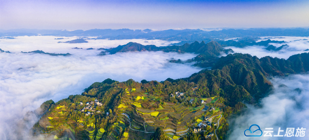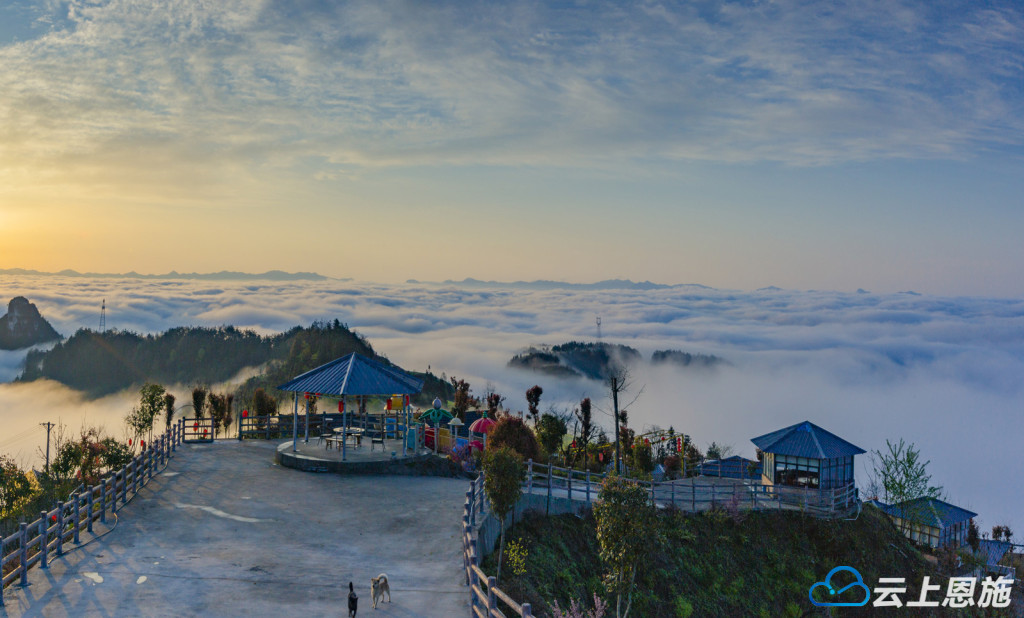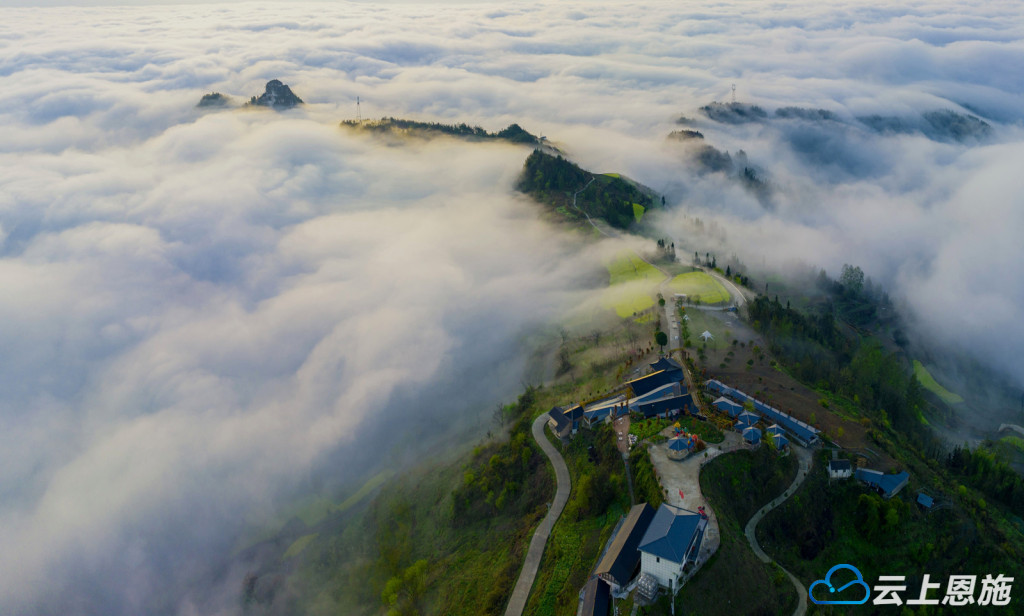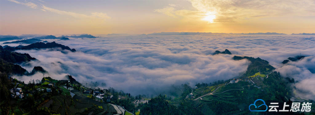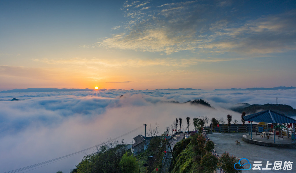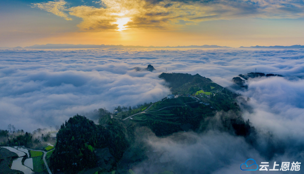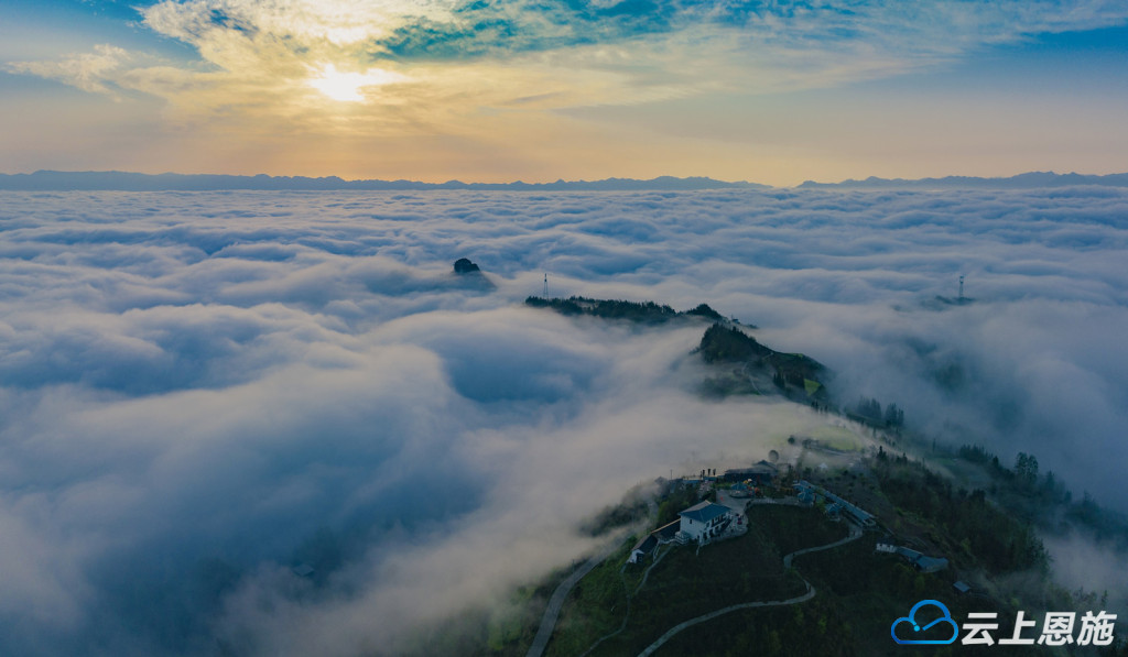 时值暮春,来凤县翔凤镇香花村迎来了观赏云海和日出的好时节。洁白的流云,把一座座山峦遮掩得若隐若现,连绵的远山与奔腾的云海相依相偎,翻腾流淌之间演绎云海奇观,与绚丽的朝霞交相辉映,震撼绝伦!