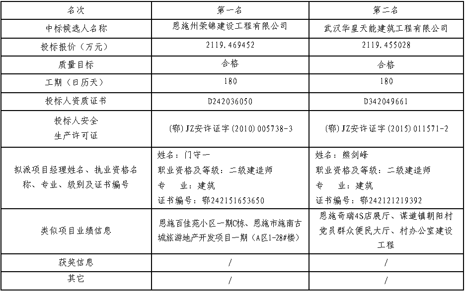 宣恩县万寨乡伍家台村易地扶贫搬迁工程于2016年8月9日至8月15日在恩施州公共资源交易信息网上发布招标公告,2016年9月12日09:00在恩施州公共资源交易中心开标,并于2016年9月12日完成评标工作。根据评标委员会提交的评标报告,宣恩县万寨乡人民政府已经确认评标结果,现进行评标结果公示。