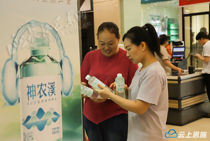 在县城熙攘广场,神农溪矿泉水摆在“C”位。工作人员穿梭于货架间,有条不紊地将一瓶瓶矿泉水摆到展示区和专属冰柜,吸引过往顾客的目光,大家纷纷前来询问购买。