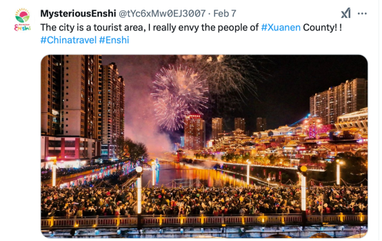 这些贴文内容既包含了非遗技艺表演的精彩视频,也有恩施人过大年的火热场景,还呈现了景区“聘请”机器狗为游客带来新服务的时髦趣味,不仅展示了中国传统春节的深厚历史底蕴,也在全球范围内扩大了恩施州文化魅力和旅游资源的曝光量和知名度。