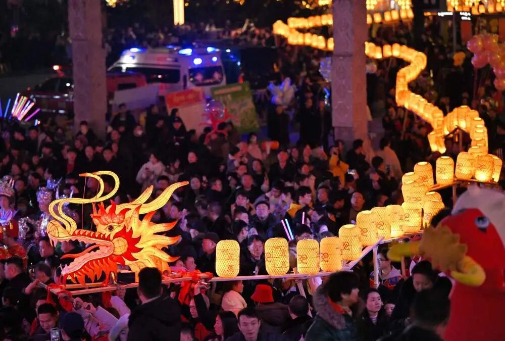 △2月10日晚,在湖北省宣恩县城兴隆老街,百米板凳龙在人群中游行。新华社发(宋文摄)