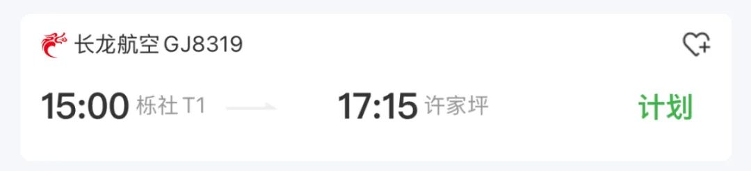GJ8319航班,15:00从宁波机场T1起飞,17:15到达恩施许家坪机场。