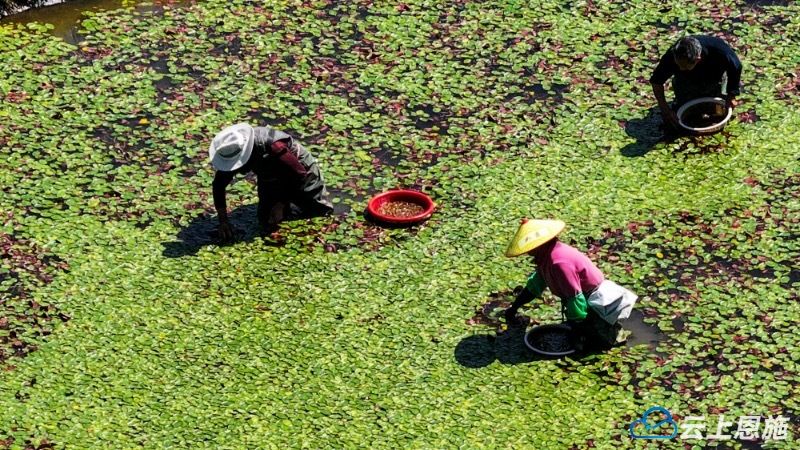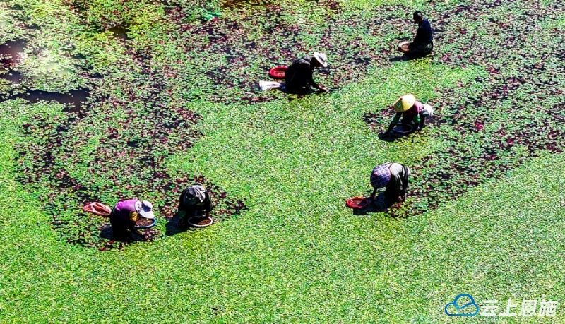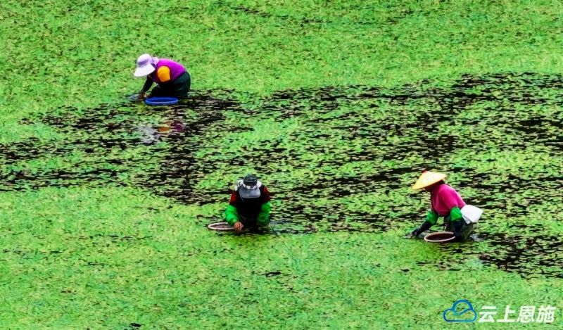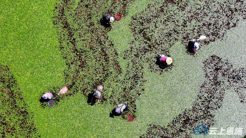 云上恩施报道(利川通联记者 朱婧 通讯员 廖显蓉)5月7日,记者走进凉雾乡继昌村千亩莼菜基地,广袤水田尽收眼底。田间,头戴竹尖帽、身着防水服的村民们正专注采摘莼菜。他们指尖轻触,叶圆茎细、柔嫩滑润的莼菜芽便欢快跃入篮中。