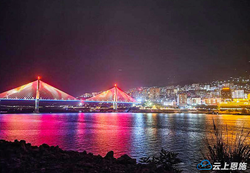 暮色四合时,巴东长江大桥便化作悬垂江面的璀璨星河。这座跨越长江南北的钢铁巨龙,在白昼承载着城市动脉的搏动,入夜则披上流动的霓裳——七彩光影在桥索间流转,与两岸楼宇的灯火交响辉映,在墨色江面投下斑斓的星雨。